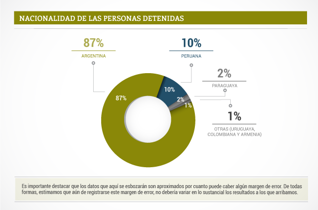Sobre la nacionalidad de los implicados en las investigaciones, el 87% eran personas de nacionalidad argentina, el 13% restante eran extranjeros (de Perú, Paraguay, y en menor medida de Uruguay, Colombia y de Armenia).