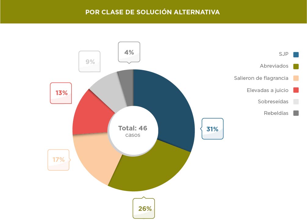 En el relevamiento, realizado por el fiscal Ariel Yapur y el auxiliar fiscal Ezequiel Ferrer, se observa cómo se resolvieron casos que incluyen robos, hurtos, lesiones agravadas por el vínculo, entre otras. De los 46 casos, 26 se resolvieron con soluciones alternativas (juicios abreviados y suspensiones de juicio a pruebas); sólo seis fueron elevadas a juicio; ocho salieron del régimen de flagrancia y el resto se reparten entre rebeldías y sobreseimientos.