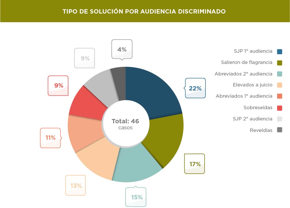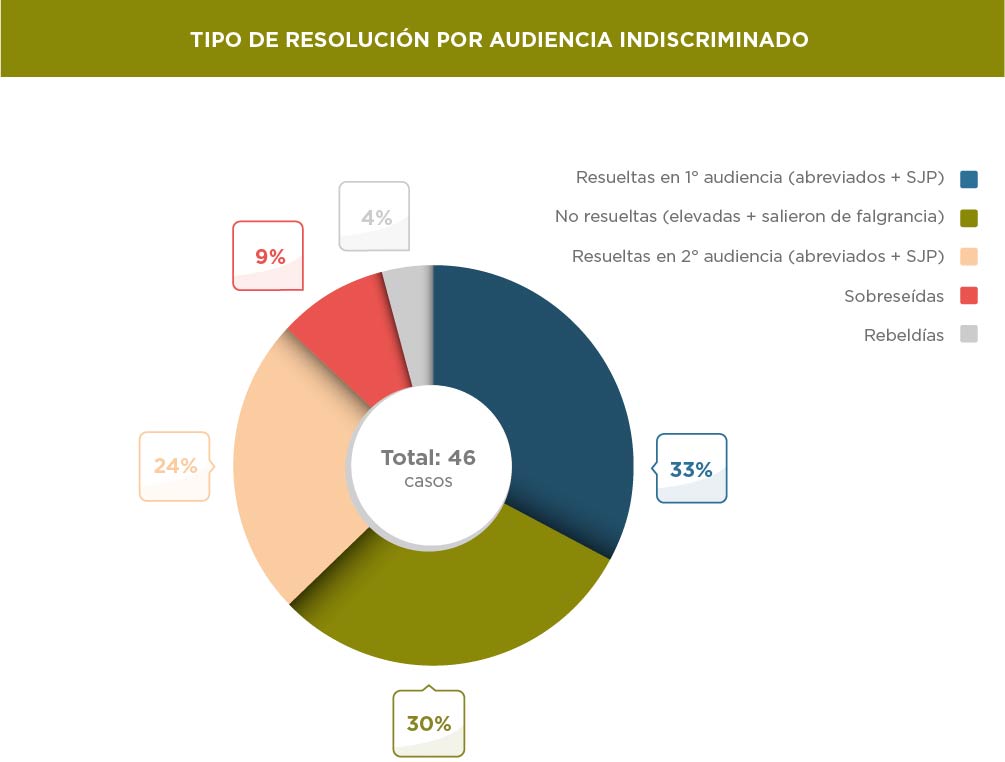 En cuanto al método por el cual se resuelven este tipo de casos, el 30% termina en una suspensión de juicio a prueba y el 26% en un abreviado. La mayor cantidad de probation se da en la primera audiencia prevista por el código mientras que la mayor parte de los abreviados se firman en la segunda audiencia.