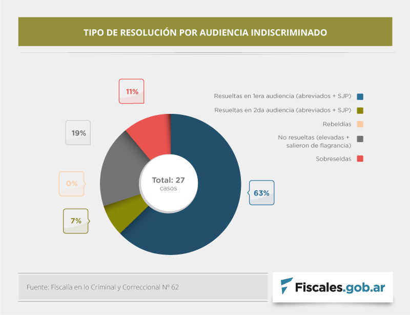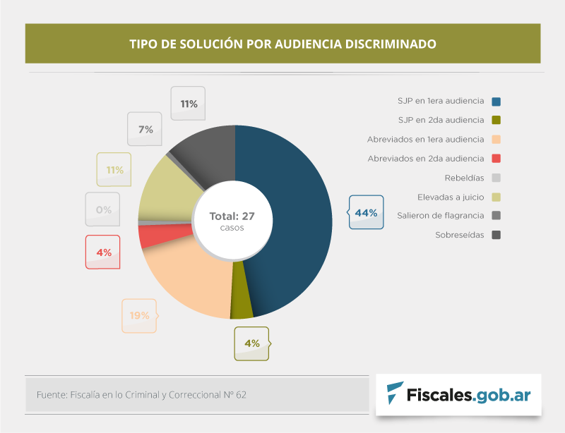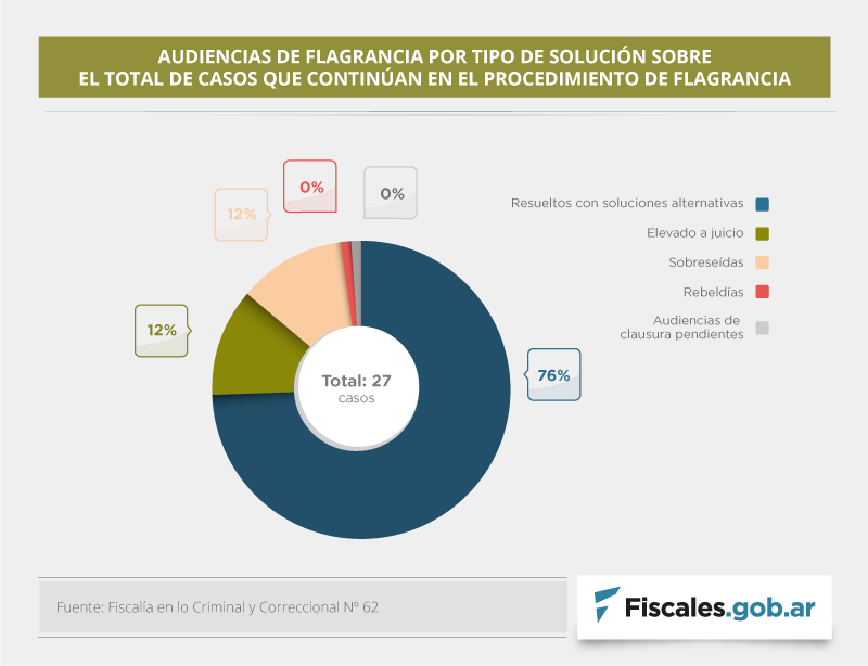 En el relevamiento, realizado por el fiscal Ariel Yapur y el auxiliar fiscal Ezequiel Ferrer se observa cómo se resolvieron casos que incluyen robos, hurtos, lesiones agravadas y estafas ocurridas en cinco comisarías de los barrios de Balvanera, Almagro, Caballito y Villa Crespo. De los 27 casos, 19 se resolvieron con soluciones alternativas: juicios abreviados y suspensiones de juicio a pruebas representan un 70% de los expedientes. Sólo tres fueron elevadas a juicio (un 11%); otras dos salieron del régimen de flagrancia y tres fueron sobreseimientos.