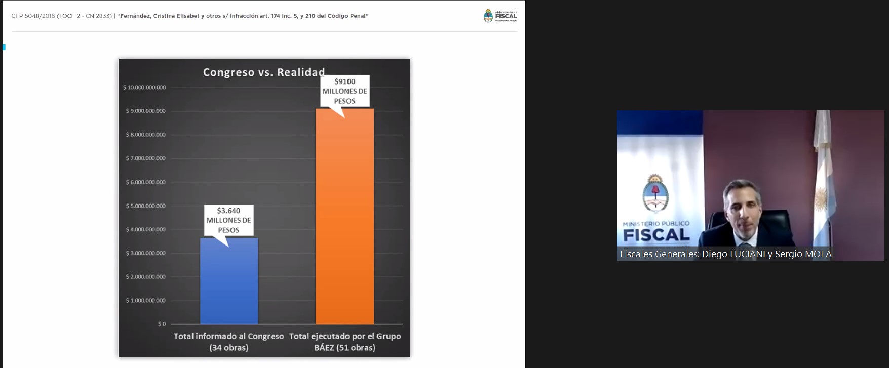 Tras un nuevo cuarto intermedio, la audiencia continuó con la exposición del fiscal Luciani, quien rebatió dos argumentos de la defensa de la vicepresidenta respecto a la cuestión presupuestaria. Recordó que, en una suerte de “deslinde de responsabilidades”, se sostuvo que “todo lo atinente a obra pública es resorte del Poder Legislativo” y que era “absurdo pretender que la Presidenta y sus ministros hayan podido conformar una asociación ilícita” y que, si hubo una asociación ilícita, debía extenderse al Poder Legislativo, que es el que le fijó los presupuestos.