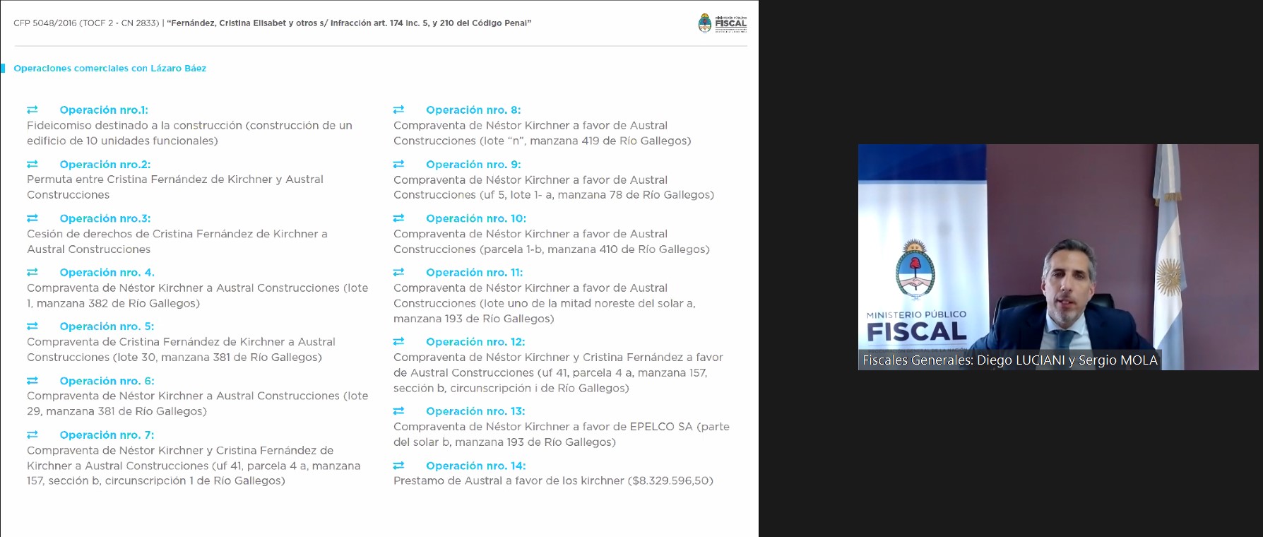 El titular de la Fiscalía General N°1 ante los Tribunales Orales en lo Criminal Federal de la Capital Federal, Diego Luciani, y el fiscal coadyuvante Sergio Mola, continuaron hoy con la séptima parte de su alegato en el marco del debate oral y público por el desvío de fondos e irregularidades en la asignación de obra pública de la provincia de Santa Cruz a empresas del grupo que encabezaba Lázaro Báez. La exposición de los representantes del MPF siguió desde esta mañana, luego de que el viernes el Tribunal Oral en lo Federal N°2 rechazara por extemporáneas las recusaciones presentadas por las defensas de la imputada y los imputados respecto de los fiscales y del camarista Rodrigo Giménez Uriburu.