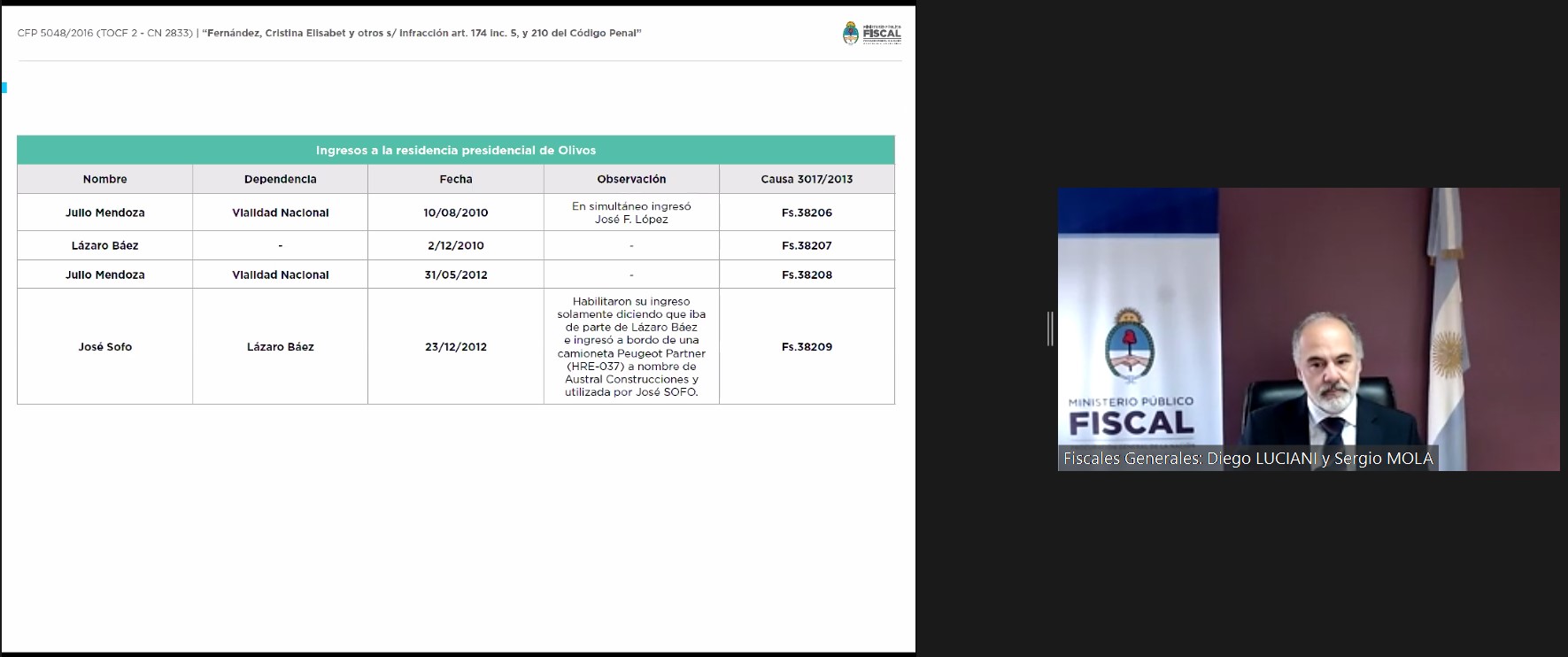 Tras un breve cuarto intermedio, el fiscal Sergio Mola retomó el alegato con foco en “cuáles fueron los motivos por los cuáles se posibilitó este sistema de corrupción generalizada, que se desarrolló a partir de la adjudicación de obras viales en Santa Cruz al grupo de empresas vinculadas a Lázaro Báez”. Así, se refirió a los organismos de control de la Administración Pública y otros organismos con funciones de control, tales como la Administración Federal de Ingresos Públicos (AFIP) y la Inspección General de Justicia (IGJ).