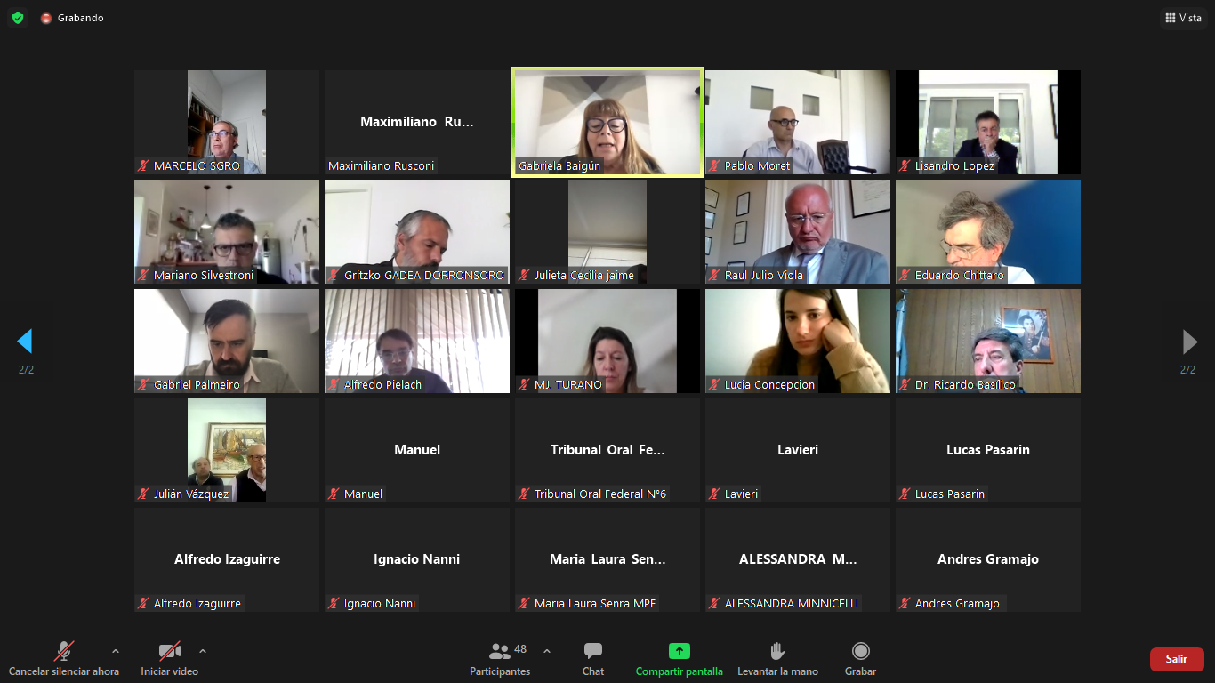 Previo al petitorio de la pena, la fiscal Baigún requirió al tribunal que solicitara a los acusados presentes que encendieran sus cámaras, en el marco de la audiencia virtual vía Zoom.