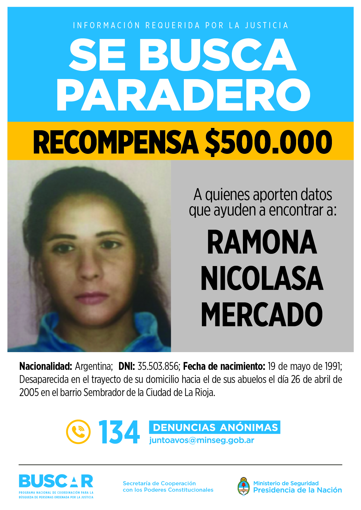 A pedido de la responsable de la Fiscalía Federal de Primera Instancia de La Rioja, María Virginia Miguel Carmona, el Ministerio de Seguridad de la Nación ofrece $500.000 de recompensa para quienes aporten datos que permitan encontrar a Ramona Nicolasa “Peli” Mercado –actualmente tendría 28 años-, quien fuera vista por última vez el 26 de abril de 2005, cuando se dirigía a la casa de sus abuelos, en el barrio “Sembrador” de la ciudad de la Rioja.