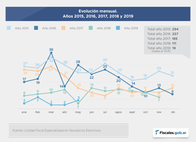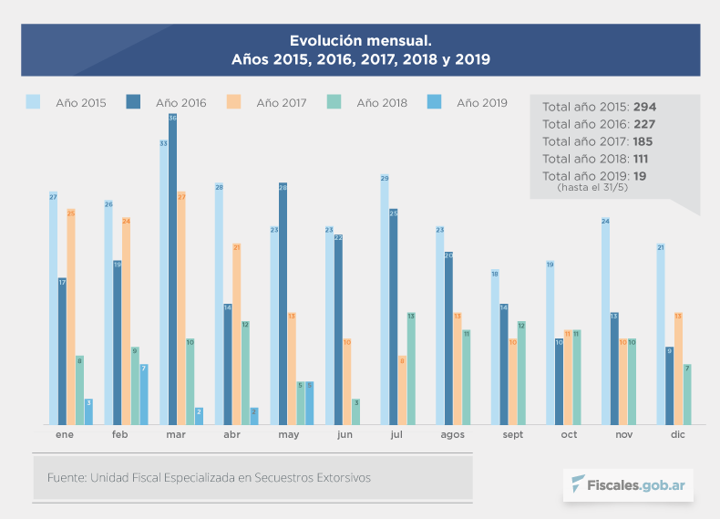La Unidad Fiscal Especializada en Secuestros Extorsivos (UFESE), a cargo del fiscal federal Santiago Marquevich, presentó su informe correspondiente al mes de mayo de 2019, del que se desprende que se registraron cinco secuestros extorsivos durante ese periodo en todo el país, lo que implica un aumento de los casos en comparación a abril, en el que se registraron sólo dos hechos.
