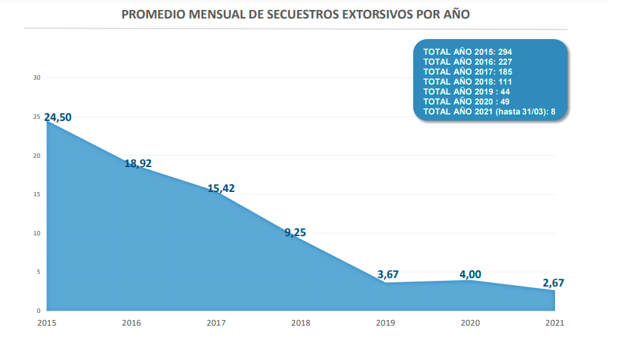 El relevamiento de los datos desde el 2015 hasta el 31 de marzo de 2021 señala una tendencia a la disminución de este tipo de hechos. Así, en 2015 existieron 294 secuestros extorsivos; en 2016, 227; en 2017 existieron 185 casos; en 2018, 111 hechos; en 2019, 44 casos; en 2020, sólo 49 secuestros y, en lo que va del 2021, tan sólo 8. Ello evidencia que la cifra de hechos denunciados disminuyó de 24,5 a 2,6 casos mensuales.