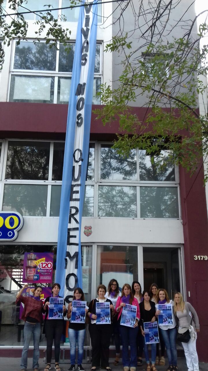 Luego del espacio de diálogo, las mujeres judiciales –identificadas con pañuelos violetas- estuvieron en la vía pública repartiendo volantes que tenían como consiga central: “No hay Justicia sin igualdad”, y además reclamaban: “Respuestas eficaces a la violencia machista; evitar la revictimización de las víctimas de la trata de personas; eliminación de los prejuicios de género, desde el lenguaje y en los procesos judiciales”. Sobre el edificio de la avenida Independencia colgaba una bandera celeste y blanca que decía: “Vivas nos queremos”.
