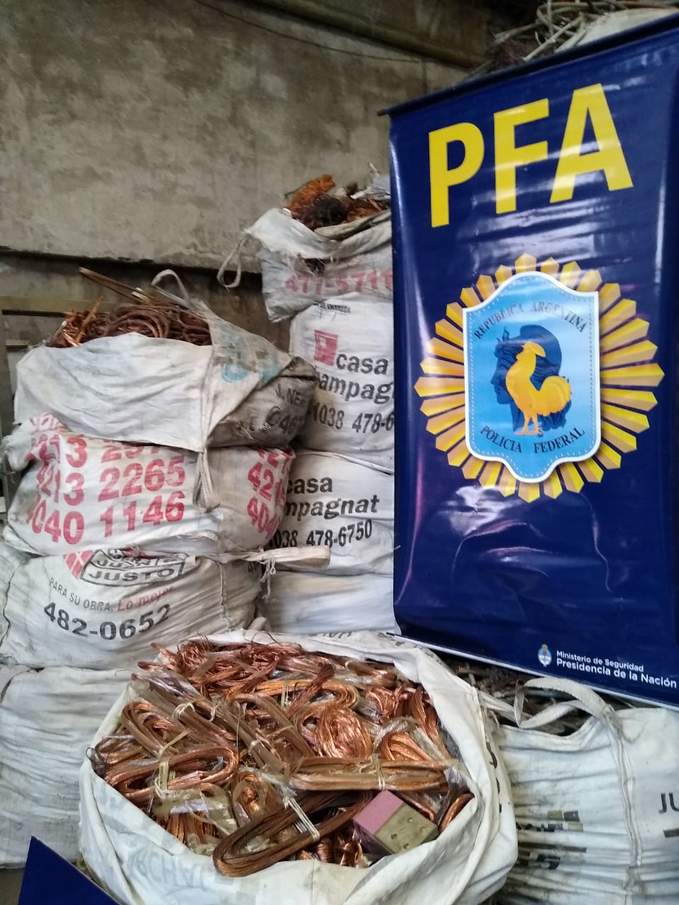 El resultado de los allanamientos realizados este miércoles fue el secuestro de automóviles –algunos de los cuales participaron de las maniobras delictivas-, dinero en efectivo –posiblemente fruto de los hechos-, armas, teléfonos y DVR que serán analizados por los investigadores, y 38 bolsones -28 en un domicilio y 10 en otro-, con un peso aproximado de 350 kilos cada uno, lo que arroja un total de casi 13.500 kilos de cobre.