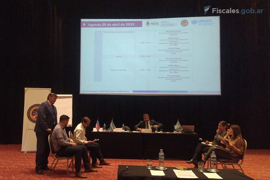 El taller estuvo a cargo de docentes nacionales y extranjeros y participaron el magistrado de la Sala Penal del Tribunal Superior de Bogotá (Colombia), Carlos Andrés Guzmán; el juez de juicio penal del Tribunal de Flagrancias del Segundo Circuito Judicial de San José (Costa Rica), Carlos Núñez; el especialista en litigación oral, Diego Calo Maiza; el coordinador de UNODC por Colombia, Esteban Arias Melo; el fiscal federal a cargo del Área Delitos Complejos de la Unidad Fiscal Salta, Ricardo Toranzos, y la coordinadora de la Unidad Especial Estratégica para la Implementación del Sistema Penal Acusatorio (UNISA) de la Procuración General de la Nación, Carla Di Gangi.