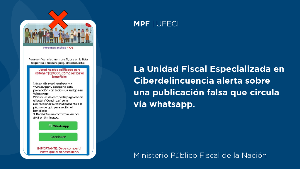 La Unidad Fiscal Especializada en Ciberdelincuencia (UFECI), a cargo del fiscal Horacio Azzolin, ha recibido varios reportes sobre un mensaje que se ha difundido por mensajería de WhatsApp.