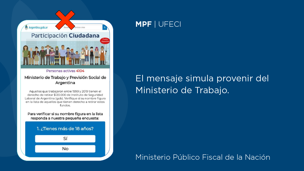 La información simula provenir del Ministerio de Trabajo, Empleo y Seguridad Social y convoca a un colectivo indeterminado de trabajadores/as a ingresar a un sitio web para obtener una supuesta suma de dinero por haber trabajado entre los años 1990 y 2019. El portal, que finge ser de un organismo oficial, invita al personal a verificar ciertos datos, en especial su edad y número de teléfono.