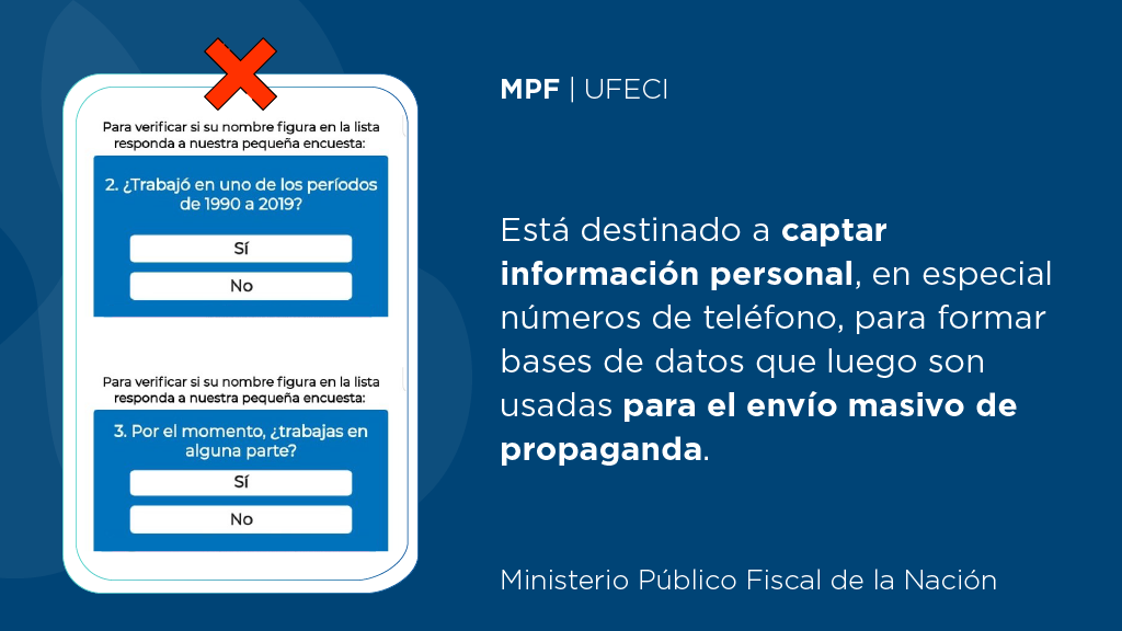 La UFECI alerta que se trata de un engaño, destinado a captar datos personales, en especial números de teléfono para formar bases de datos que luego son usadas para el envío masivo de propaganda. La unidad especializada recomienda desestimar estos mensajes.