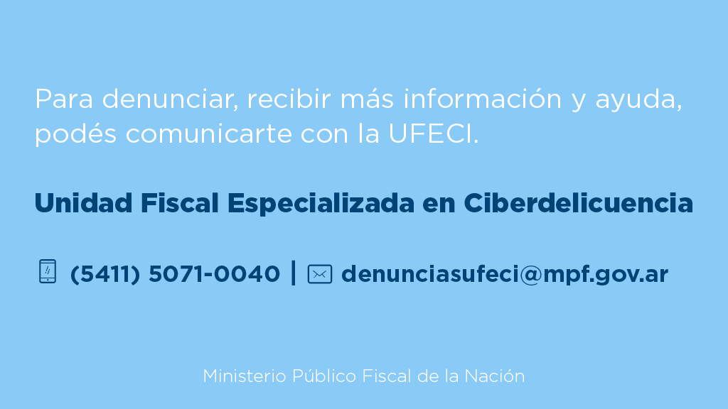 Ante cualquier duda comunicate con la Unidad Fiscal Especialidad en Ciberdelincuencia (UFECI) del MPF, enviando un correo electrónico a denunciasufeci@mpf.gov.ar, y/o ante la autoridad de protección de datos personales de tu provincia.