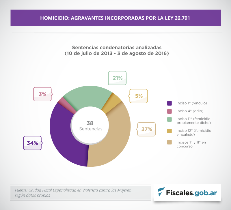“Al analizar las sentencias según el agravante aplicado, se observa que en el 37% se aplicaron los incisos 1° (vínculo) y 11° (femicidio) en concurso ideal, y en el 34% se aplicó sólo el inciso 1° (vínculo). Corresponden a 14 y 13 sentencias respectivamente”, detalló la UFEM. Y en el 21% de las sentencias (8 casos) “se agravó el homicidio exclusivamente por el inciso 11° (femicidio)”. De las 38 sentencias, sólo en dos casos se aplicó el inciso 12° (femicidio vinculado), y hay una única sentencia por el inciso 4° (odio de género).