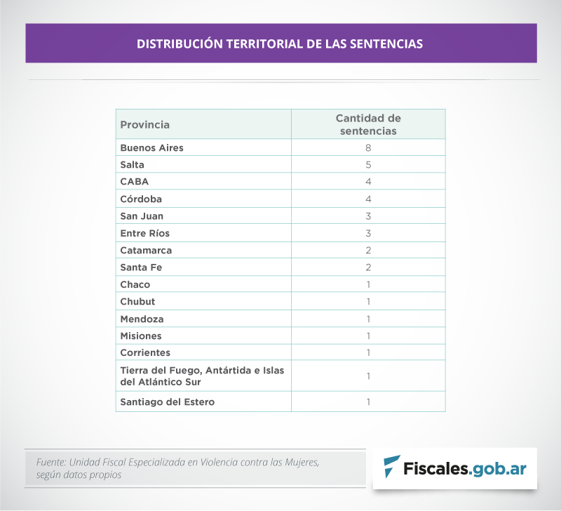 En cuanto a la distribución geográfica de las resoluciones de los tribunales orales analizadas, se produjeron en 15 jurisdicciones: la provincia de Buenos Aires presenta la mayor cantidad de sentencias, con ocho. Luego se ubica Salta con cinco; la Ciudad Autónoma de Buenos Aires y Córdoba con cuatro; Entre Ríos y San Juan con tres; Catamarca y Santa Fe con dos;  y las siguen Chaco, Chubut, Corrientes, Misiones, Mendoza, Santiago del Estero y Tierra del Fuego con un caso cada una. En tres de las provincias “existen condenas solo por el inciso 1° (homicidio agravado por el vínculo)”, es decir, no por femicidio.