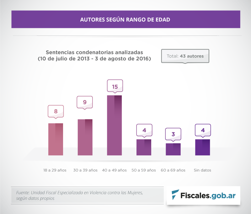 De las 38 sentencias relevadas surgen 43 autores, de los cuales 42 fueron varones. Sólo hay una mujer condenada como coautora de un homicidio agravado por vínculo y por violencia de género (incisos 1 y 11). El 35% de los victimarios tenía entre 40 y 49 años al momento del hecho; el 21%, entre 30 y 39 años, y el 19% entre 18 y 29 años.