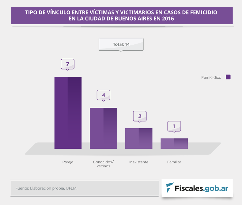 El material elaborado por UFEM destaca que entre los casos de femicidio, en el 86% existía algún tipo de vínculo entre víctima y victimario. En siete oportunidades, unía a la víctima y el victimario un vínculo de pareja (actual o pasada); en un caso el vínculo era familiar, mientras que tres víctimas fueron asesinadas por personas conocidas/vecinos. Las restantes dos fueron asesinadas por una persona desconocida para ellas. Así, se observa que si bien en la mayoría de los casos víctima y victimario se conocían, 5 de las 13 víctimas de femicidio fueron asesinadas por personas fuera de su ámbito de pareja y/o familiar.