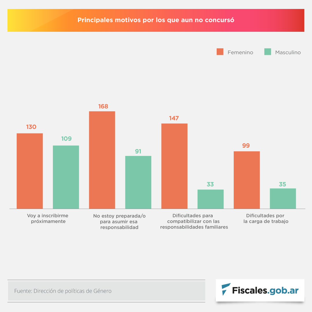 Otro de los hallazgos preliminares que se destaca es la brecha de género en los concursos para los cargos de magistratura. Como se destaca en el gráfico a continuación, el principal motivo para no concursar es la percepción de falta de preparación para asumir el rol. Al momento de incluir una perspectiva de género en el análisis se da cuenta que el 64% son mujeres – siendo que en el organismo el porcentaje de mujeres funcionarias es levemente superior que de varones. Por otra parte, de quienes consideran incompatible la tarea fiscal con las responsabilidades familiares solo el 19% son varones.