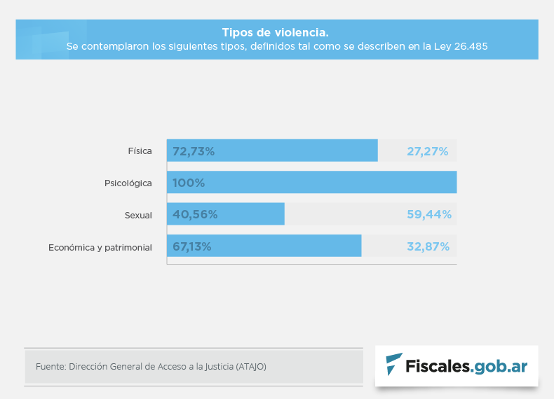 El equipo de "ATAJO Protegen" analizó los tipos de violencia previstos en la Ley 26.485, de Protección integral para prevenir, sancionar y erradicar la violencia contra las mujeres en los ámbitos que desarrollen sus relaciones interpersonales, que fueron denunciados en las distintas sedes. De este modo, especificó que en el 100% de los casos denunciados está presente la violencia psicológica mientras que en el 72,73% de las denuncias recibidas se observan situaciones de violencia física. Por otra parte, en el 40,56% hubo violencia sexual y en el 67,13% se registraron violencias económicas y patrimoniales.