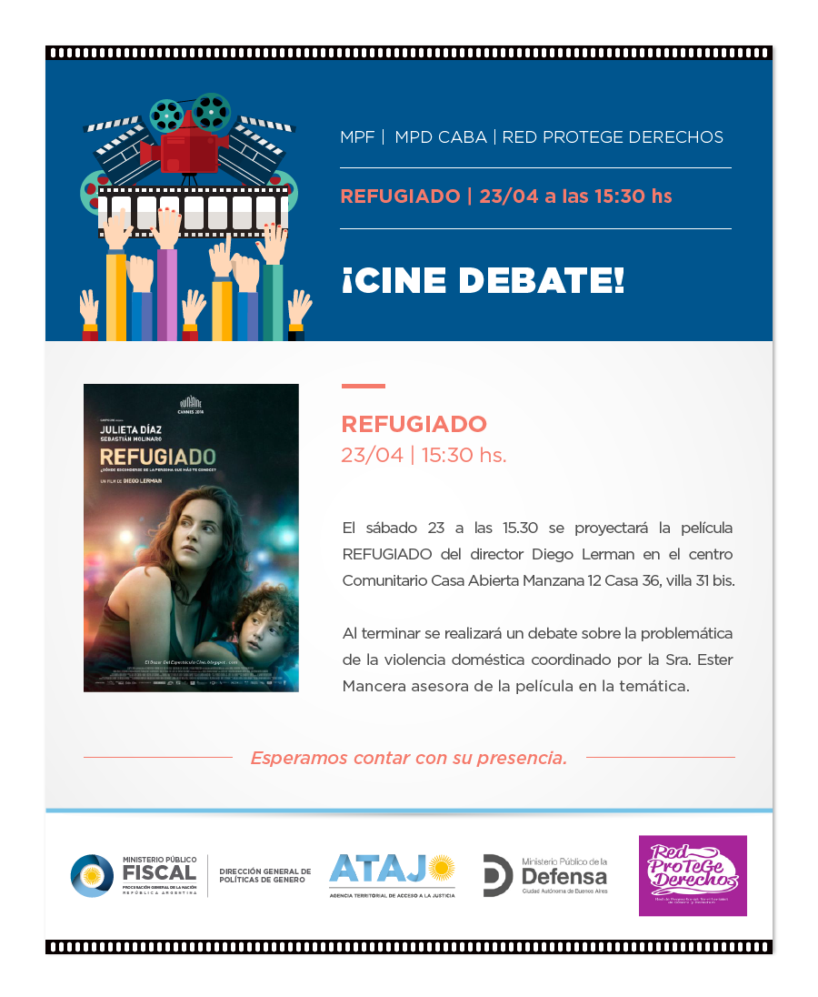 El sábado 23 de abril a las 15:30, se proyectará la película “Refugiado” del director Diego Lerman. Esta actividad de cine comunitario se realiza en conjunto con el equipo de Promotoras Territoriales en Género. La formación de las promotoras, vecinas del barrio, se lleva adelante desde el año pasado por medio de la articulación entre el ATAJO de la villa 31 y 31 bis, la Dirección General de Políticas de Género y el Área de Género y Diversidad del Ministerio Público de la Defensa de CABA.