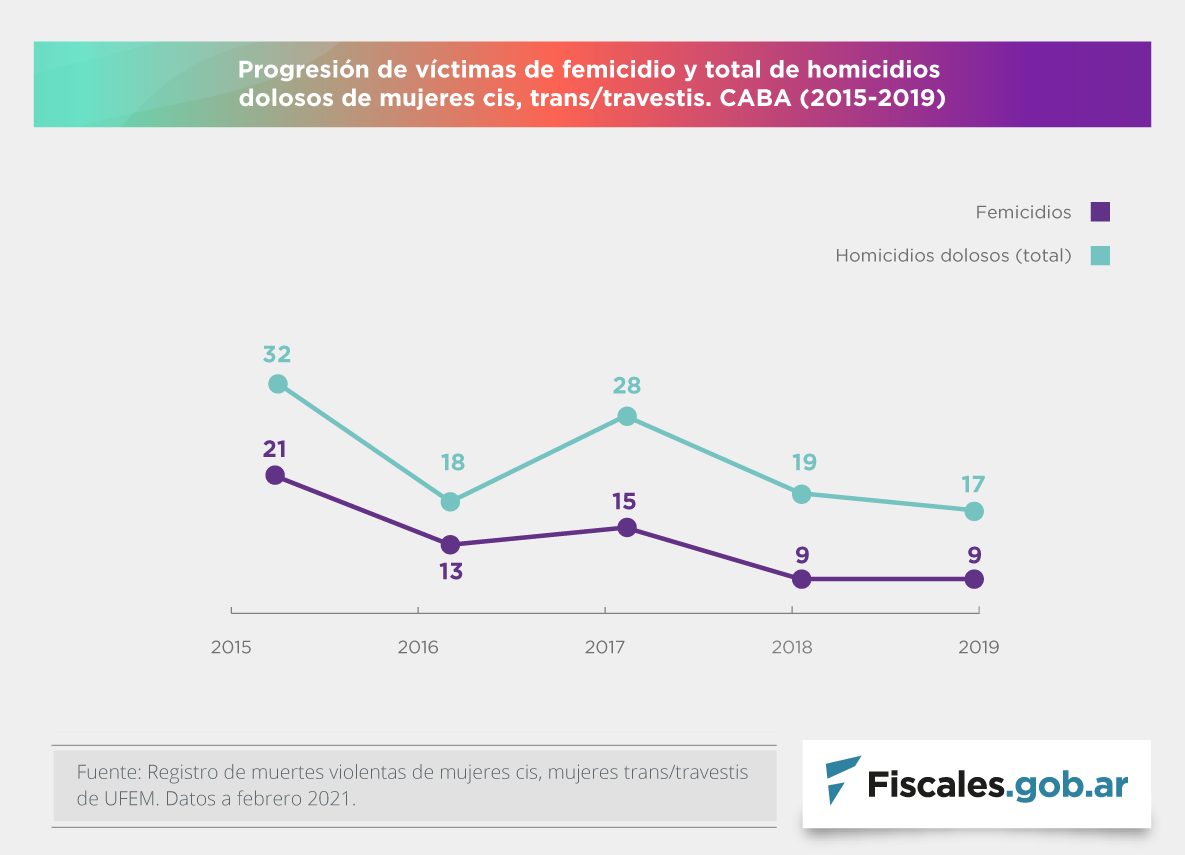 Cabe recordar, además, que la UFEM desarrolla desde su creación en 2015 un Registro de los homicidios dolosos con víctimas de identidades femeninas -mujeres, mujeres trans y otras femineidades- en la capital federal, cuyo resultado se ha plasmado en la publicación de cinco informes anuales denominados “Homicidios dolosos de mujeres, femicidios, transfemicidios y travesticidios en la Ciudad Autónoma de Buenos Aires” correspondientes a los años 2015, 2016, 2017, 2018 y 2019.
