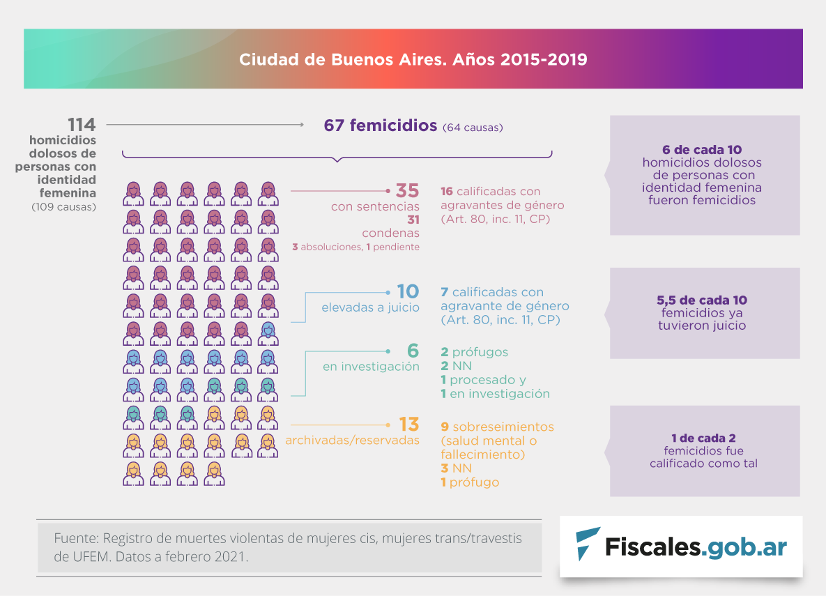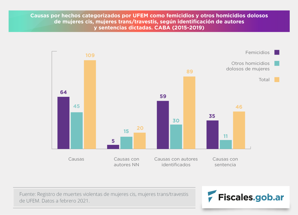 De acuerdo al Relevamiento, entre 2015 y 2019 se registraron 114 víctimas de homicidios dolosos con identidades femeninas, que tramitaron o tramitan en 109 expedientes judiciales dentro de los fueros Nacional en lo Criminal y Correccional y Nacional en lo Criminal y Correccional Federal. Sobre este total de homicidios, un 59 por ciento fueron clasificados con los indicadores de la UFEM como femicidios/transfemicidios (67 casos).