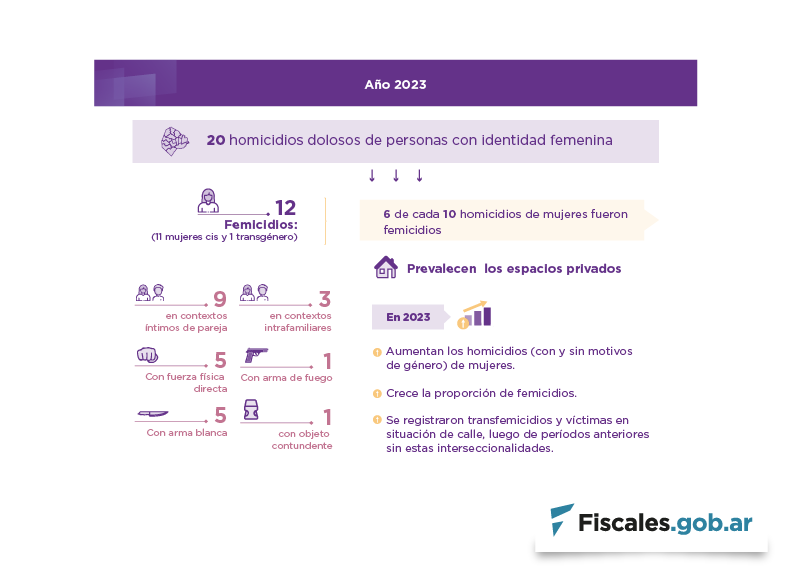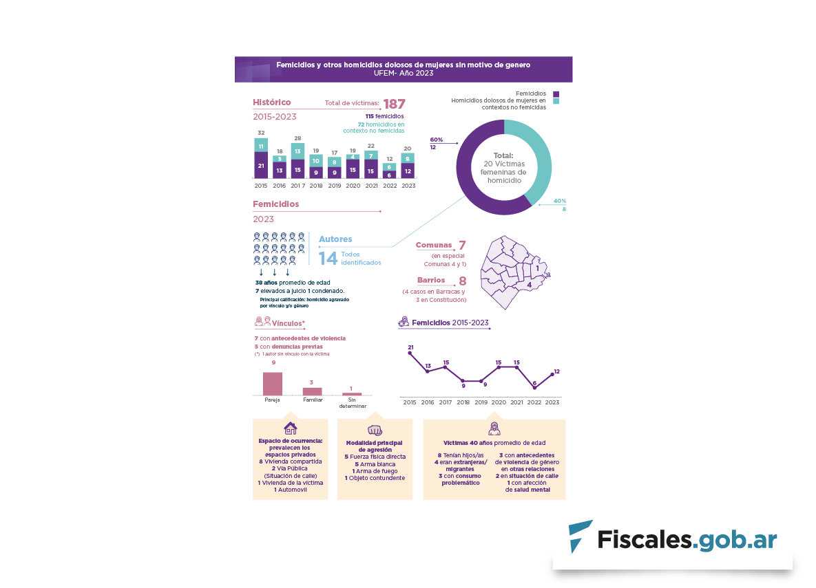 En 2023 se produjeron 20 homicidios dolosos de mujeres en la Ciudad de Buenos Aires, de los cuales 12 fueron clasificados como femicidios por la Unidad Fiscal Especializada en violencia contra las mujeres (UFEM), a cargo de la fiscal Mariela Labozzetta. La información surge del noveno informe anual sobre “Femicidios, transfemicidios, travesticidios y homicidios dolosos de mujeres en la Ciudad Autónoma de Buenos Aires”. Allí se expone que, respecto del año anterior, creció la cantidad de homicidios dolosos con víctimas femeninas (de 12 en 2022 a 20 en 2023), retornando a la media histórica de casos, luego de una inusual baja en la cantidad de casos durante 2022.