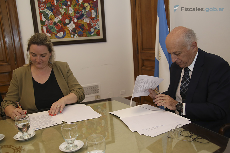 El procurador general de la Nación interino, Eduardo Casal, y Florence Raes, representante para la Argentina de la Entidad de las Naciones Unidas para la Igualdad de Género y Empoderamiento de Mujeres (ONU Mujeres) suscribieron esta mañana un Memorando de Entendimiento con el objeto de establecer una relación de colaboración institucional técnica para el desarrollo de proyectos y actividades conjuntas contra la discriminación, la desigualdad, las violencias contra las mujeres y otros grupos en situación de vulnerabilidad por su orientación sexual e identidad de género, trata y explotación de personas.. La firma fue en la sede de la Procuración General de la Nación, ubicada en Perón 667 del microcentro de la Ciudad Autónoma de Buenos Aires.