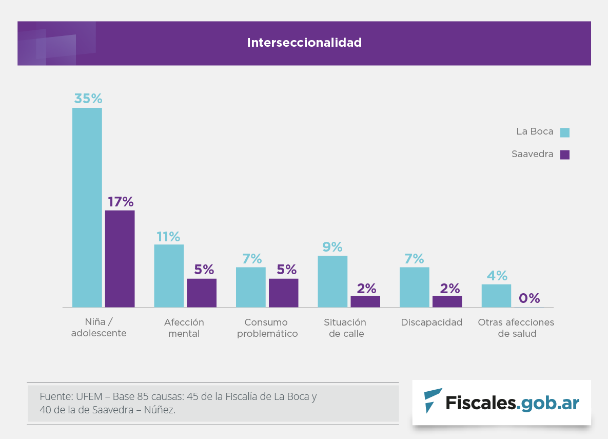 Otros factores de interseccionalidad son más frecuentes en La Boca, además de la edad más reducida de las víctimas al momento del hecho (niñas o adolescentes), un menor nivel educativo alcanzado de las denunciantes, una mayor proporción de víctimas en situación de calle o de criticidad habitacional y padecimientos en materia de salud mental.