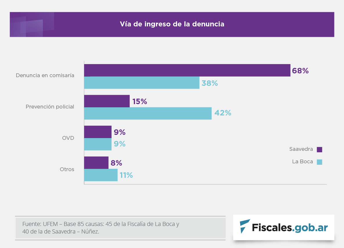 Las diferencias también se verifican en la forma en que se inician las causas. Mientras que en Saavedra y Núñez el 68% comenzó a partir de la denuncia formulada en comisaría o sede policial, en la Fiscalía de La Boca esta proporción es sensiblemente menor (38%), con mayor prevalencia (42%) de inicio de actuaciones por intervención de la prevención policial en el lugar del hecho.