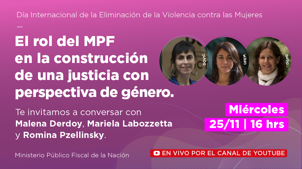 Mariela Labozzetta, Malena Derdoy y Romina Pzellinsky dialogan en vivo por el canal de Youtube del Ministerio Público Fiscal, en el marco del Día Internacional de la Eliminación de la Violencia contra las Mujeres. Presenta el secretario de Coordinación Institucional, Juan Manuel Olima, y modera Sol Rodríguez Garnica.