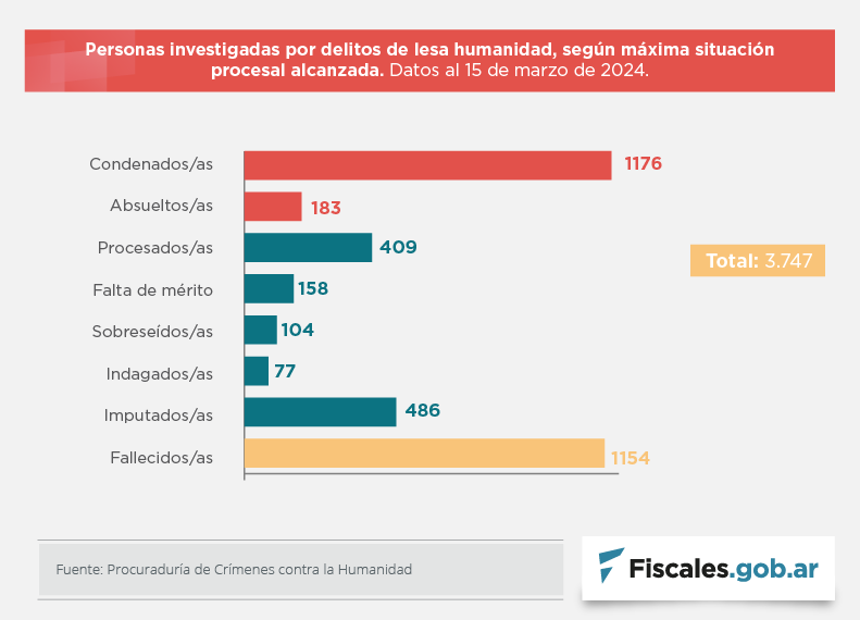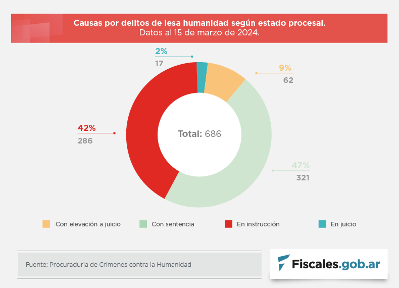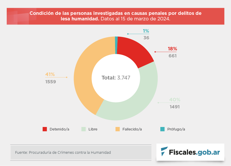 Los datos de la estadística publicada por la oficina especializada a cargo de la fiscal federal María Ángeles Ramos son el resultado de la información suministrada hasta el 15 de marzo pasado por las fiscalías federales y unidades fiscales de todo el país que intervienen en los procesos por crímenes de lesa humanidad cometidos durante el terrorismo de Estado.