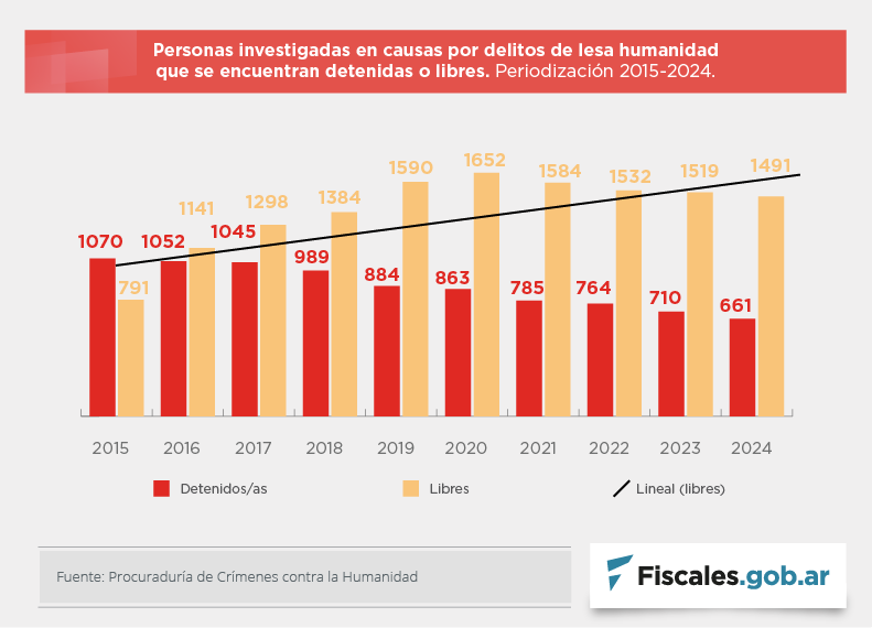 En este contexto se registran 661 personas detenidas, 1491 permanecen en libertad y 36 están prófugas. La comparación anual evidencia que el último año en que se registraron más personas detenidas que en libertad fue 2015. A partir de 2016, el segundo grupo comenzó a superar paulatinamente al primero. Y desde 2021 las personas en libertad son más del doble que las detenidas.