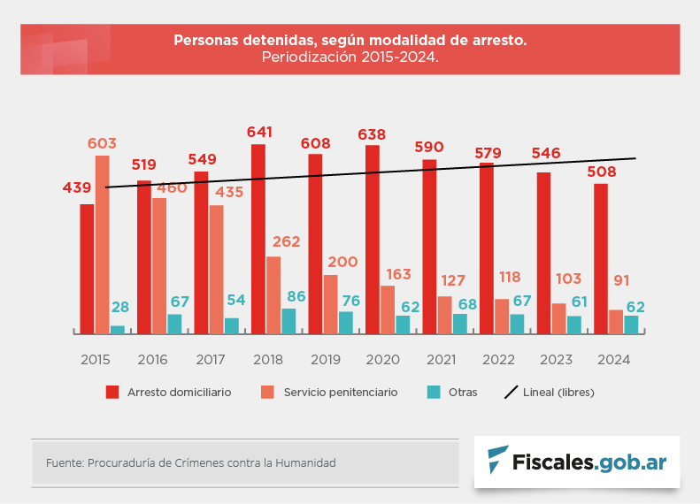 Entre quienes se encuentran privados y privadas de la libertad, 508 obtuvieron el arresto domiciliario, mientras que 91 permanecen en establecimientos penitenciarios y 62 se encuentran en otro tipo de dependencias. De estos últimos, 61 están en la denominada Unidad N°34 del Servicio Penitenciario Federal, que funciona en el ámbito de la guarnición militar de Campo de Mayo y que, por esa particularidad, la procuraduría especializada no considera una institución penitenciaria.