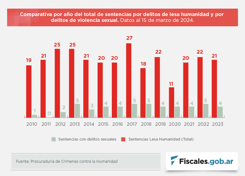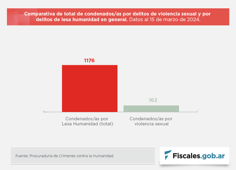 Uno de los aspectos que puso de relieve la procuraduría en la difusión de las estadísticas tiene relación con el juzgamiento y la visibilización de los delitos de violencia sexual. Puntualizó que 162 de las 1176 personas condenadas por crímenes de lesa humanidad fueron encontradas responsables de esos delitos. La visibilización de la violencia sexual aparece en 53 sentencias, el 17% del total.