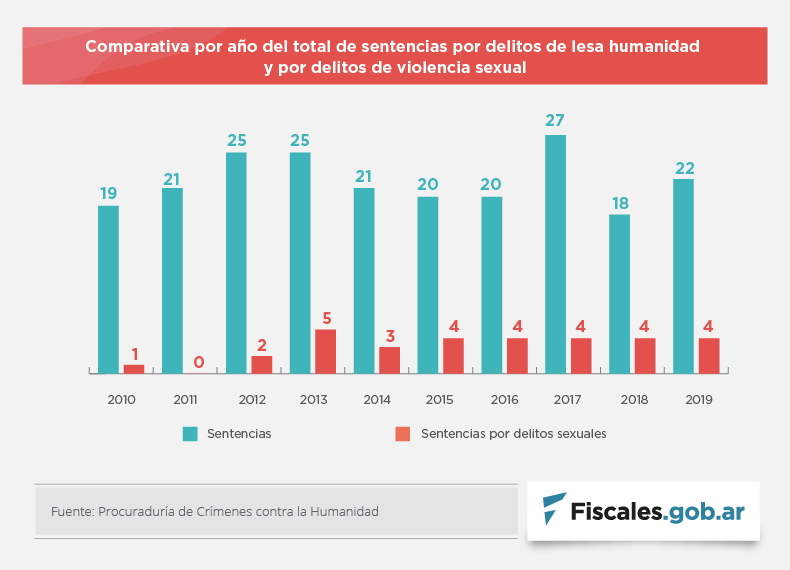Desde el año 2012 el Ministerio Público Fiscal de la Nación impulsa la persecución penal de los crímenes de violencia sexual cometidos durante el terrorismo de Estado, considerándolos delitos autónomos, buscando visibilizarlos y para establecer responsabilidades. Este trabajo ha generado un incremento en la cantidad de sentencias que tratan el tema, siendo el año 2013 el pico máximo de sentencias obtenidas (5). Y desde 2014 se mantiene constante la cantidad de sentencias por año (4).