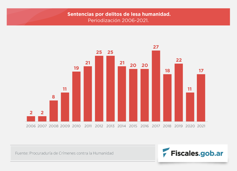 Las cifras de esta estadística corresponden al informe anual de la Procuraduría de Crímenes contra la Humanidad (PCCH), cerradas al 1° de diciembre de 2021, por lo que no ingresaron en el recuento las condenas dictadas el 2 de diciembre a dos ex policías y a la esposa de uno de ellos en Mendoza en el caso de la apropiación de una niña e impuestas el 9 de diciembre a 15 militares y policías en Neuquén en el juicio "Escuelita VII".