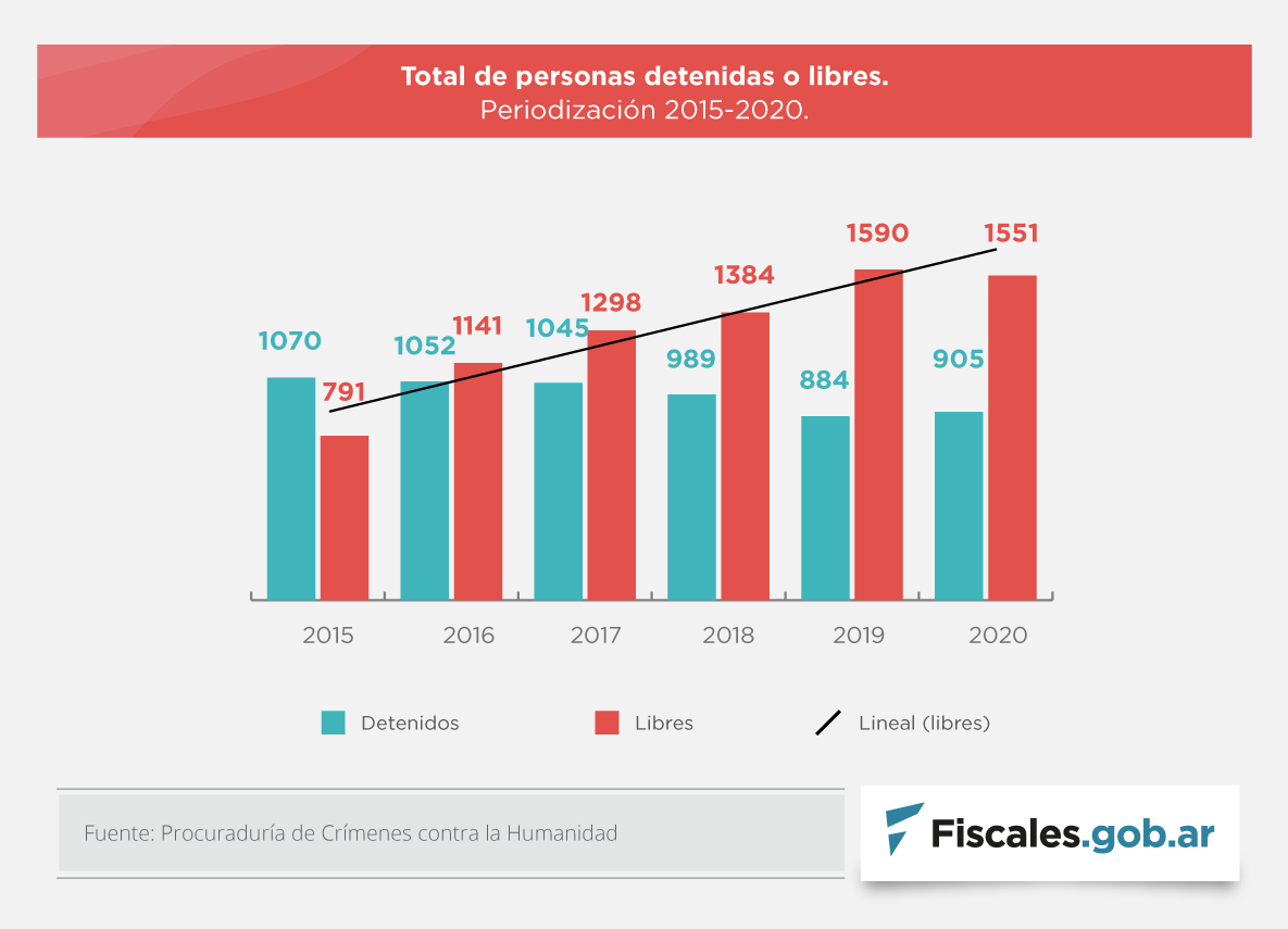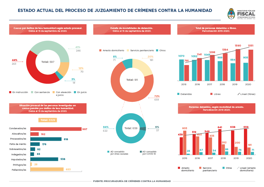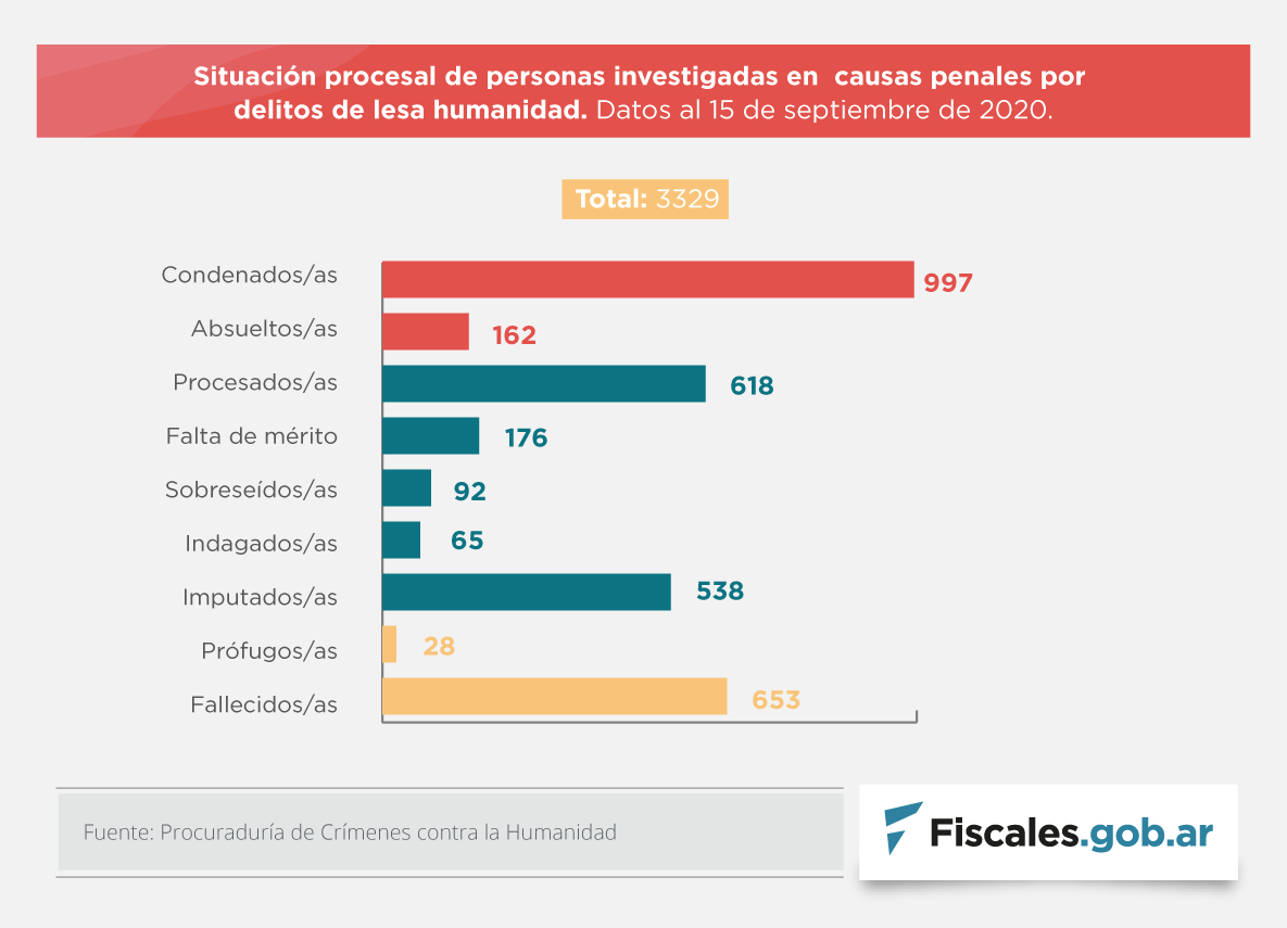 El documento elaborado por la procuraduría especializada indica que se registran un total de 3329 personas investigadas por delitos de lesa humanidad. La cifra desagregada consta de 618 personas procesadas, 538 imputadas, 176 con falta de mérito, 162 absueltas, 92 sobreseídas, 65 indagadas, 28 prófugas y los 997 condenadas. Asimismo, fallecieron 653 personas investigadas por crímenes cometidos durante la época del terrorismo de Estado desde la reapertura de las causas.