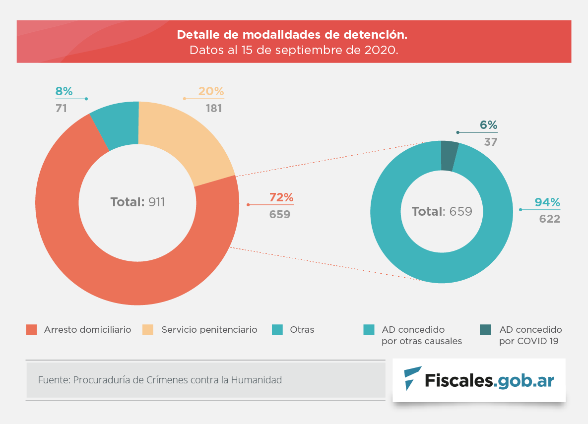 Desde otro ángulo, 659 personas cumplen arresto domiciliario, lo que representa el 72 por ciento de los casos de personas detenidas. En tanto, unas 181, es decir, un 20 por ciento del total de privadas de la libertad, permanece en unidades penitenciarias. El restante 8 por ciento está alojado en otras dependencias.