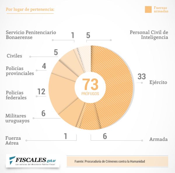 Son 73 los prófugos por delitos de lesa humanidad con orden de captura y buscados por diferentes fuerzas de seguridad, según el relevamiento actualizado a diario por la Procuraduría de Crímenes contra la Humanidad, que reúne los reportes de todos los fiscales federales que intervienen en los procesos judiciales en donde se juzgan los delitos del terrorismo de Estado.