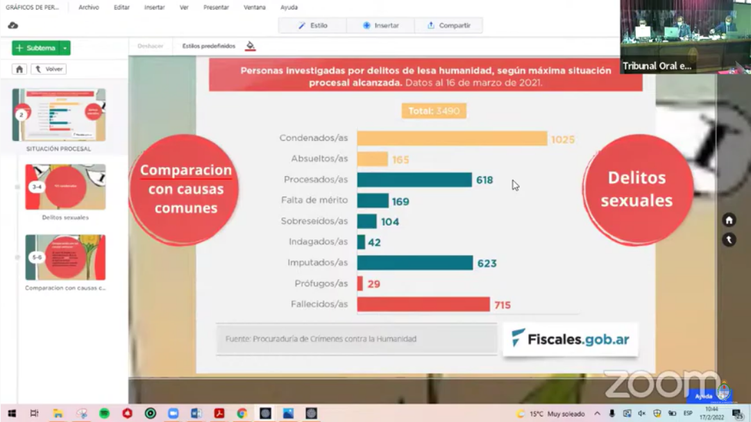 Luego, el fiscal citó las últimas estadísticas de la Procuraduría de Crímenes contra la Humanidad sobre el estado actual del proceso de juzgamiento de los crímenes contra la humanidad e indicó que “el índice de absoluciones, sobreseimientos y faltas de mérito es del 42% en causas de lesa humanidad, significativamente más que en las causas comunes”.