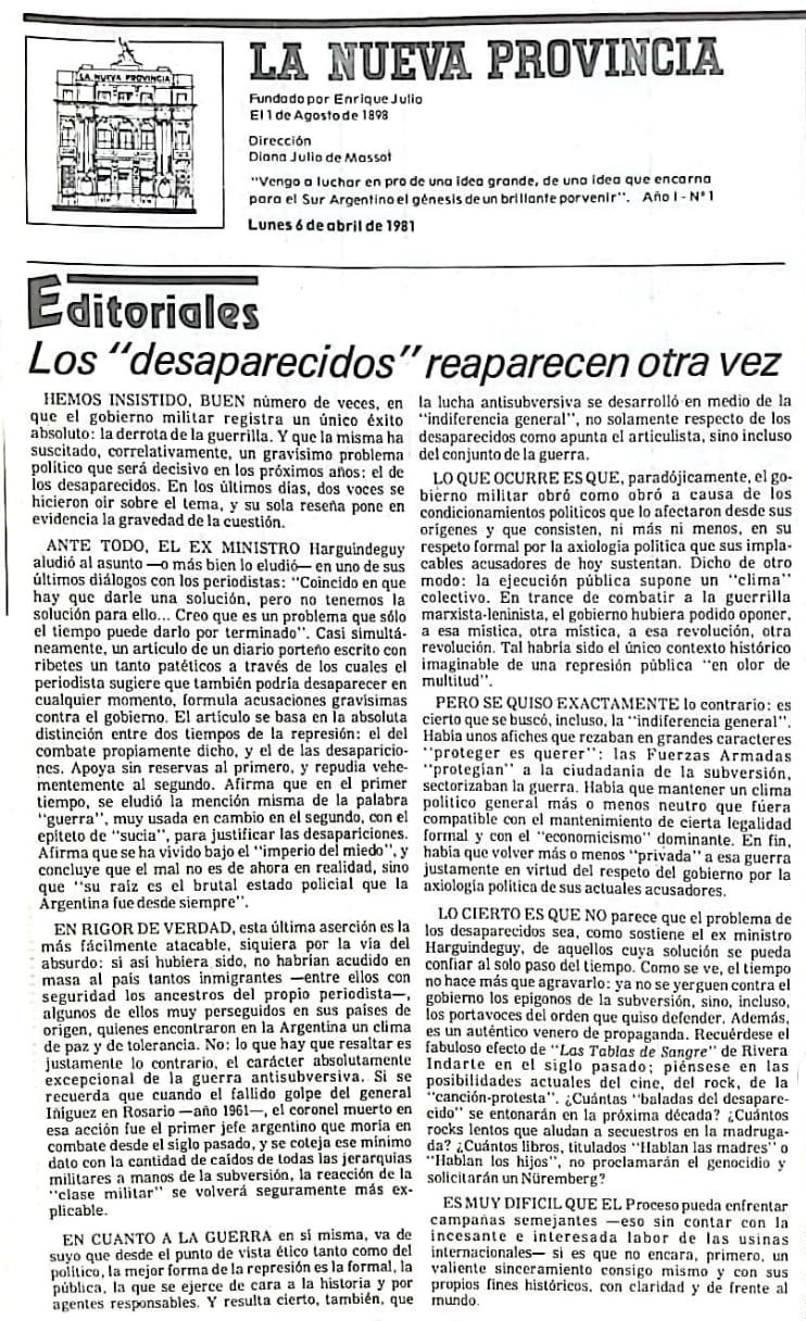 En otro artículo del 20 de junio de 1976, titulado “Si vis pacem, para Bellum. El ejemplo tucumano enseña que las guerras se ganan luchando”, se insta a combatir la subversión “de manera no convencional, en todos los frentes de batalla: en la selva, el monte, la ciudad, la universidad, el hospital, el caféconcert, el periodismo, la televisión e, incluso, la Iglesia”.