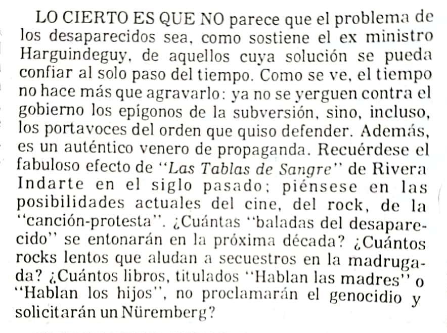Los fiscales citaron además una nota publicada en la edición del 2 de febrero de 1976 con el título “¡Argentinos, a las Armas!”: “Al enemigo hay que combatirlo con sus propias tácticas, sin concesiones, treguas ni cortapisas, sin pedir permiso ni andarse con contemplaciones respecto de lo que se hace o lo que se hará. No salvan a la Nación, por cierto, quienes viéndola en peligro y desfalleciente siempre encuentran tiempo para especulaciones de baja politiquería acerca de si caben o no medidas no convencionales frente a la agresión aleve del enemigo. No pueden existir concesiones de ningún tipo cuando la Nación está en peligro”.