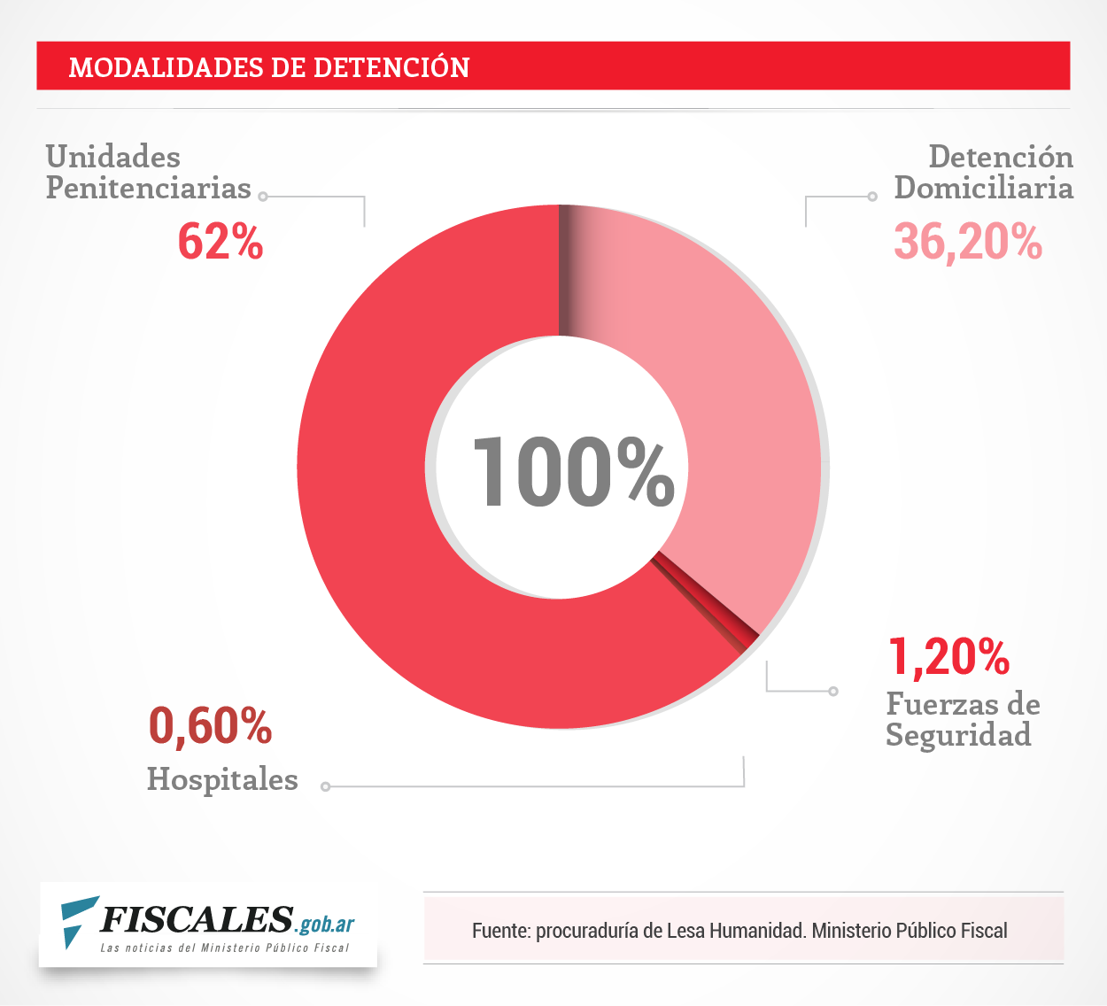 La Procuraduría de Crímenes contra la Humanidad también precisó que actualmente hay 1017 personas detenidas, de las cuales el 62 por ciento cumple con prisión en unidades carcelarias; un 36,2 lo hace en detención domiciliaria; el 1,20, en dependencias de fuerzas de seguridad nacionales y provinciales y un 0,6 por ciento en hospitales.