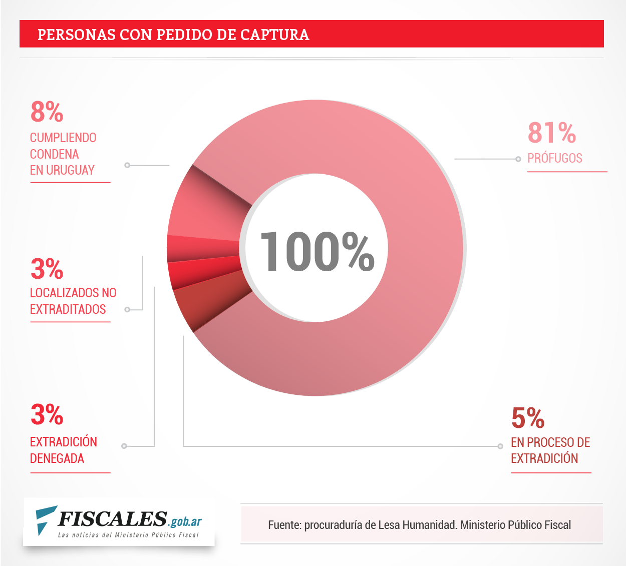 De esta forma, se puntualiza que actualmente se encuentran técnicamente prófugas 61 personas, mientras que otras cuatro se encuentran en proceso de extradición, en otros dos casos la extradición fue denegada, hay otras "dos localizadas que aún no han sido extraditadas y seis que se encuentran cumpliendo condena en Uruguay, cuyas extradiciones se concretarán una vez que estas sean cumplidas". En total, se trata de 75 personas que no están a disposición de los jueces que reclaman juzgarlas.