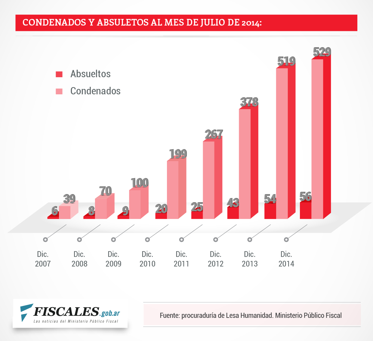 El mismo informe indica que desde la recuperación del Estado de Derecho en 1983, la cantidad de condenados por crímenes durante la última dictadura cívico-militar asciende a 529 -varios recibieron más de una condena- y la cantidad de absueltos suman 56. Entre tanto, sólo 114 condenas se encuentran firmes, que comprenden a 108 personas juzgadas en 51 procesos. "Buena parte de estas condenas firmes son por juicios llevados a cabo en la década de 1980 y casos de apropiación de menores", indica el trabajo de la Procuraduría a cargo del fiscal General Jorge Auat, con la coordinación de Carolina Varsky.