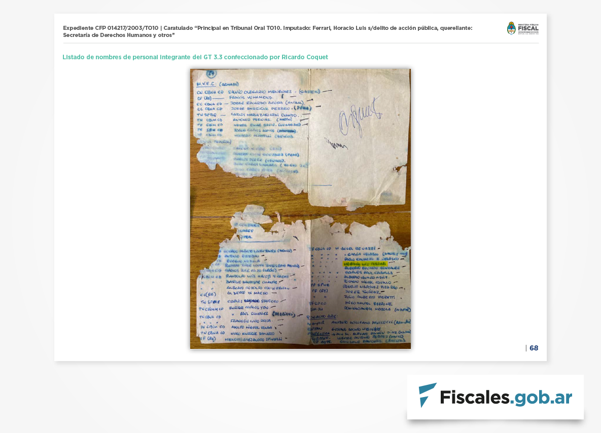 La nómina de represores de la ESMA reconstruida por el sobreviviente Ricardo Héctor Coquet fue presentada por la fiscalía durante el alegato.