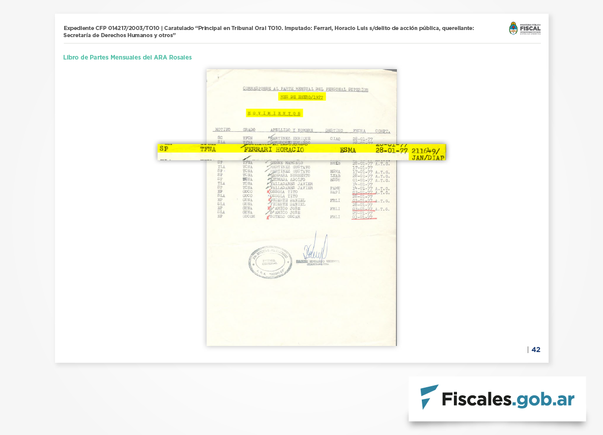 El equipo fiscal sumó a ello los libros del Historial del Buque y el Libro de Partes Mensuales de Novedades del Personal Naval Superior del Destructor ARA Rosales. A partir del trabajo que realizaron los Equipos de Relevamiento y Análisis de documentación de las Fuerzas Armadas, esos documentos resultaron fundamentales para rebatir la versión del imputado y los asientos apócrifos de su legajo, pues allí constaba en el apartado “movimientos” que Ferrari fue destinado a la ESMA el 28 de enero de 1977 y que no integró la dotación de aquel buque durante 1977.