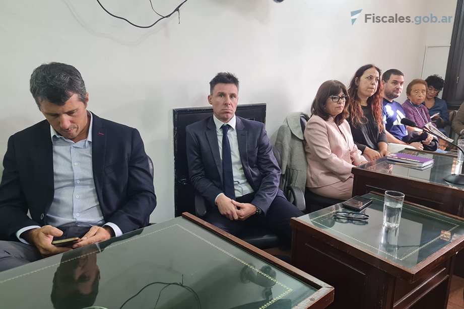 El fiscal general Carlos Gonella (a la izquierda) y el auxiliar fiscal Facundo Trotta (en el centro), durante la lectura del veredicto. Foto: gentileza de Katy García / CISPREN Córdoba
